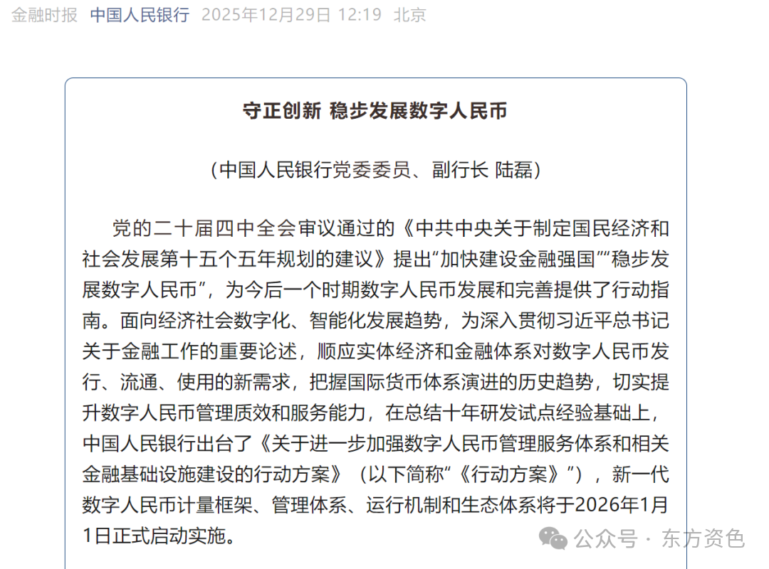 12月29日,中国人民银行党委委员、副行长陆磊在《金融时报》发表文章称,为顺应实体经济和金融体系对数字人民币发行、流通、使用的新需求,把握国际货币体系演进的历史趋势,切实提升数字人民币管理质效和服务能力,在总结十年研发试点经验基础上,中国人民银行出台了《关于进一步加强数字人民币管理服务体系和相关金融基础设施建设的行动方案》(以下简称“《行动方案》”),新一代数字人民币计量框架、管理体系、运行机制和生态体系将于2026年1月1日正式启动实施。
